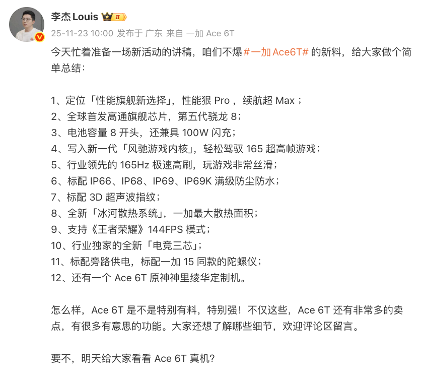 如上图所见,一加中国区总裁李杰今日发文透露了一加Ace 6T的大部分配置:定位「性能旗舰新选择」,性能狠Pro ,续航超Max;全球首发高通第五代骁龙8;电池容量8开头、100W闪充;新一代「风驰游戏内核」,165Hz高刷;标配IP66/IP68/IP69/IP69K满级防尘防水;标配3D超声波指纹;全新「冰河散热系统」,一加最大散热面积;支持《王者荣耀》144FPS 模式;行业独家的全新「电竞三芯」;标配旁路供电,标配一加15同款的陀螺仪。