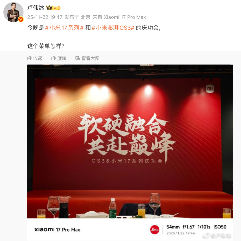 如上图所见,卢伟冰晒出了现场活动图,主海报是“软硬融合,共赴巅峰,澎湃OS3 & 小米17系列庆功会”。