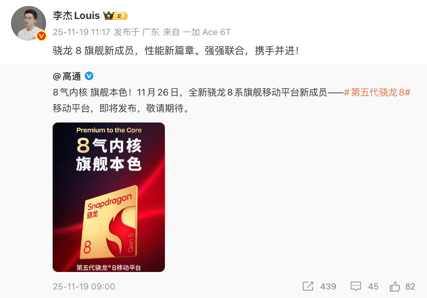 官方预热明天见,预计届时将正式公布发布会日期。作为补充,近期11月25日有华为Mate 80系列发布会,11月26日是骁龙8 Gen5发布会,大家觉得一加Ace 6T会是哪天发布?