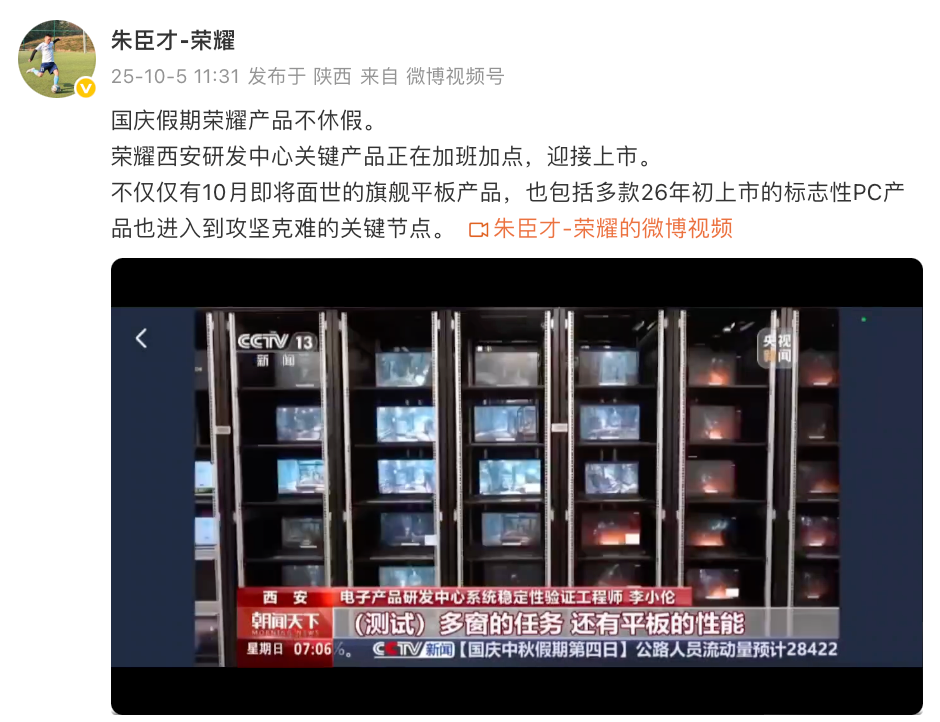 荣耀终端股份有限公司PC产品总经理朱晨才转发央视新闻相关报道透露:“