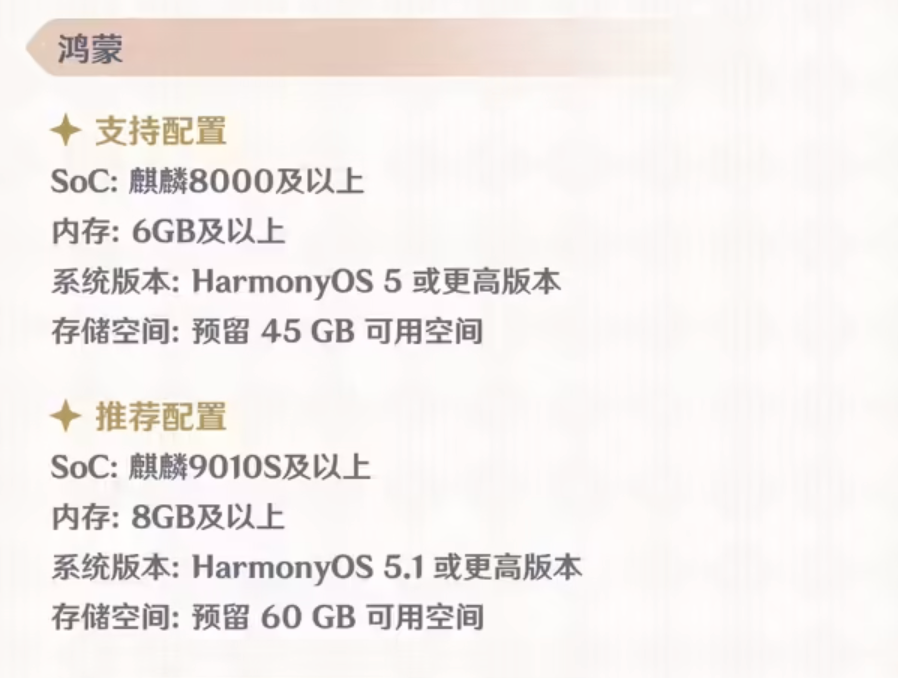 更新公告中还列举了游戏最低配置和推荐配置,《原神》鸿蒙版支持麒麟8000及以上、6GB及以上内存、HarmonyOS 5或更高版本、预留45GB可用存储空间的设备,推荐配置为:麒麟9010S及以上、8GB及以上内存、HarmonyOS 5.1或更高版本、预留60GB可用存储空间。供大家参考~