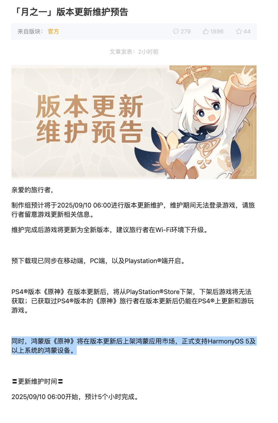 米哈游《原神》官方在米游社发布的「月之一」版本更新维护预告中提到:鸿蒙版将在9月10日版本更新后上架华为应用市场,正式支持HarmonyOS 5及以上系统设备。