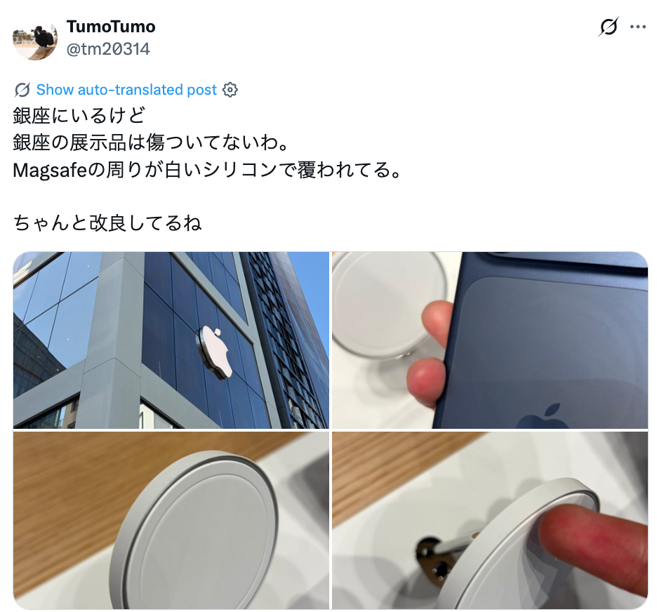 作为补充,苹果门店使用的MagSafe支架多为金属环设计,最近海外网友发现苹果银座门店已开始在支架边缘加装硅胶环,或许就是为了规避机身出现划痕?🤔