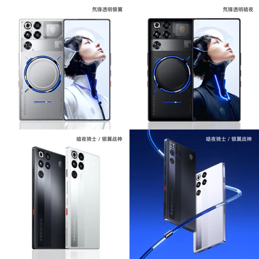 所见,红魔11 Pro系列依旧采用一块无打孔的真全面屏,屏下前置方案,具体将提供暗夜骑士、银翼战神、氘锋透明暗夜、氘锋透明银翼4个配色,其中暗夜骑士和银翼战神看起来是纯平背板设计,氘锋透明两个配色后盖则可以看到一圈蓝色元素,预计为水冷设计。
