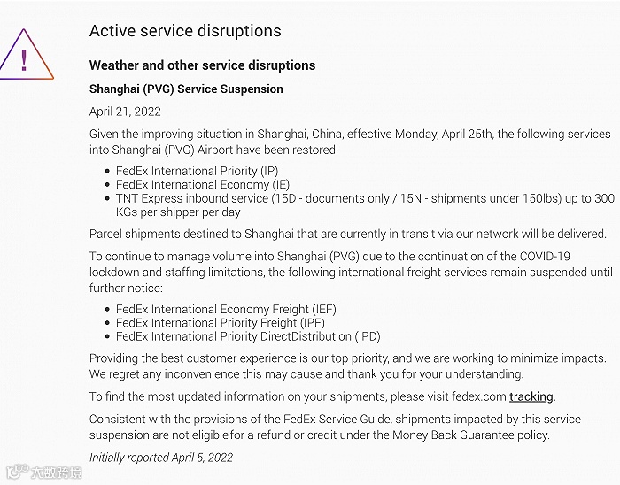 4月21日,美国快递业巨头联邦快递(FedEx)发布了“服务中断”的停运通告:所有寄往华东地区,暂停所有进入上海、江苏、浙江、安徽、江西的入境服务。