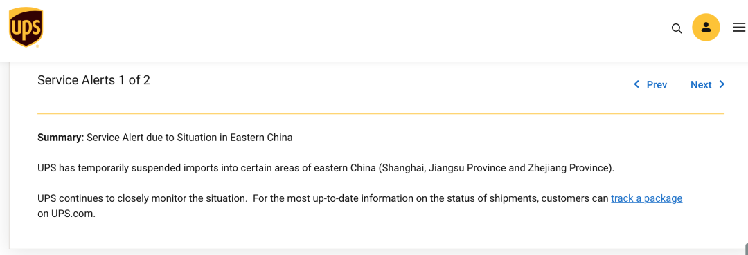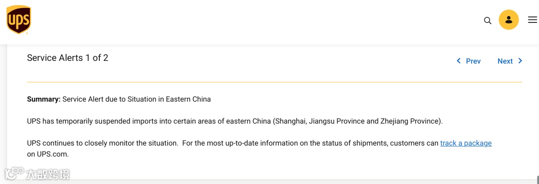 美国另一家快递业巨头,UPS也对由国际发往华东部分地区(上海、浙江、江苏)的业务实施了停运,暂停向受影响地区发货。
