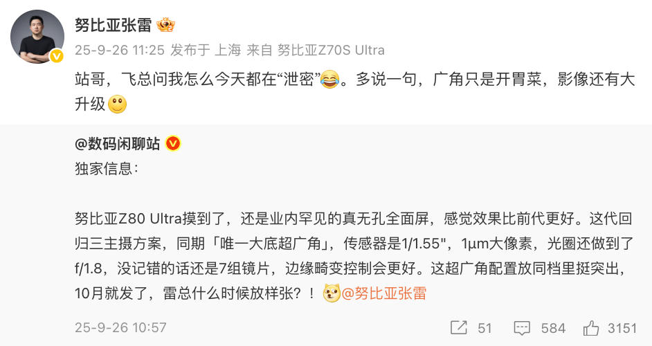 同时回归三主摄方案,同期「唯一大底超广角」,传感器是1/1.55",1μm大像素,光圈还做到了f/1.8,没记错的话还是7组镜片,边缘畸变控制会更好。这超广角配置放同档里挺突出。”大家对努比亚还有什么期待?