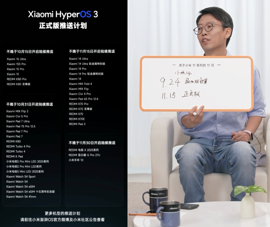 另外直播中官方还回应了小米澎湃OS3正式版什么时候推送,称小米17系列会首发出厂搭载OS3正式版,至于问的比较多的小米14何时发版,直播中小米手机系统软件部总监张国全还签下了“军令状”,表示9.24会开启Beta版招募,11.15发正式版。