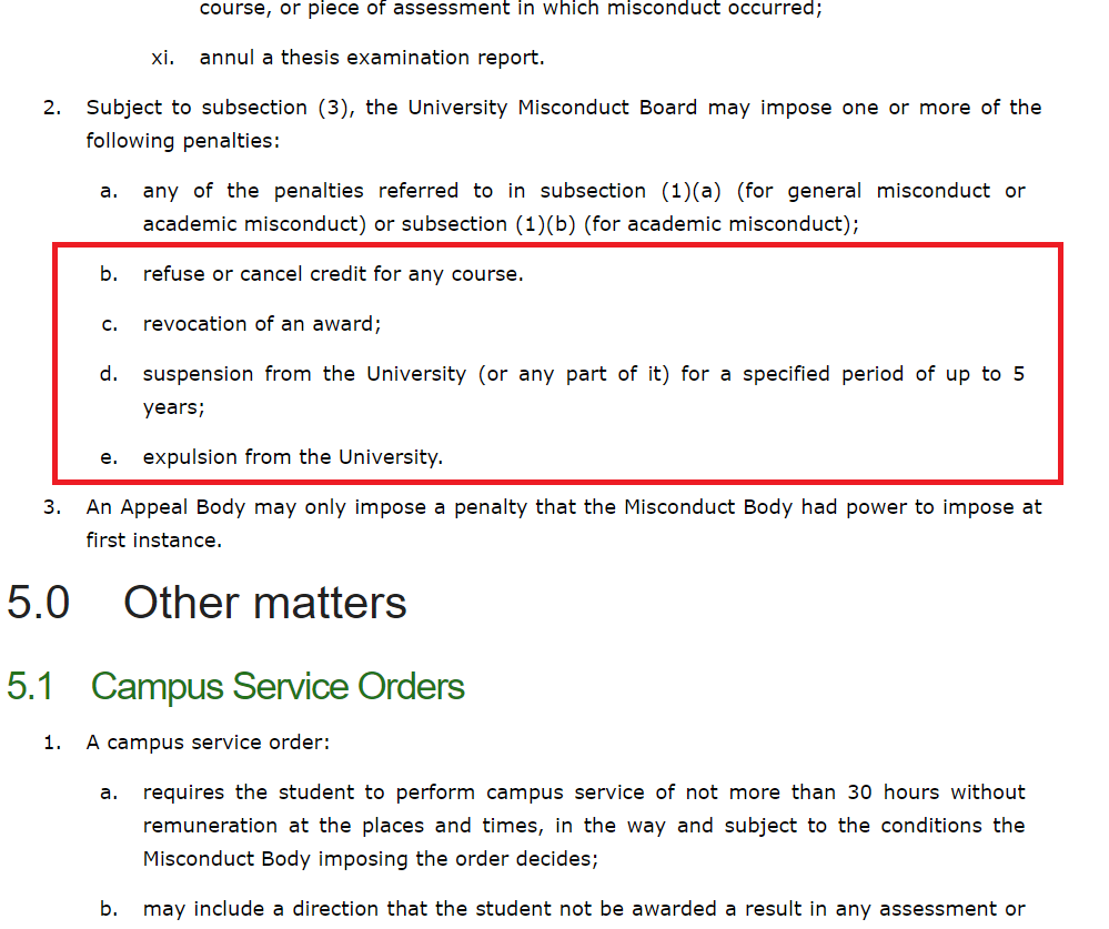 根据第(3)款的规定,昆士兰大学不当行为委员会可处以以下一项或多项处罚: