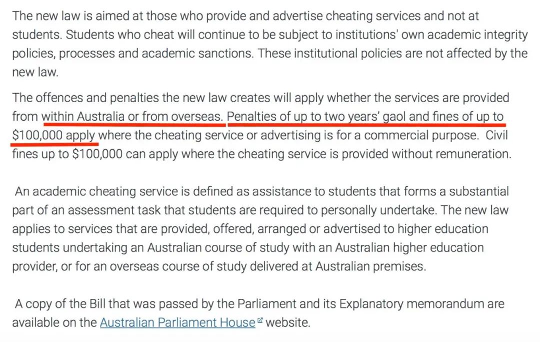 2020年,澳大利亚通过了反学术作弊法,为大学生提供代考或代写论文的有偿服务者,将面临最高两年的监禁或最高十万澳元的罚款。然而迄今为止,没有任何人因代写论文遭到过起诉。据悉,这是因为大多数此类机构都设置在海外。