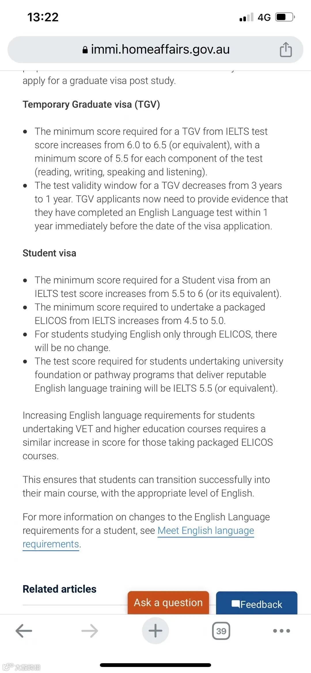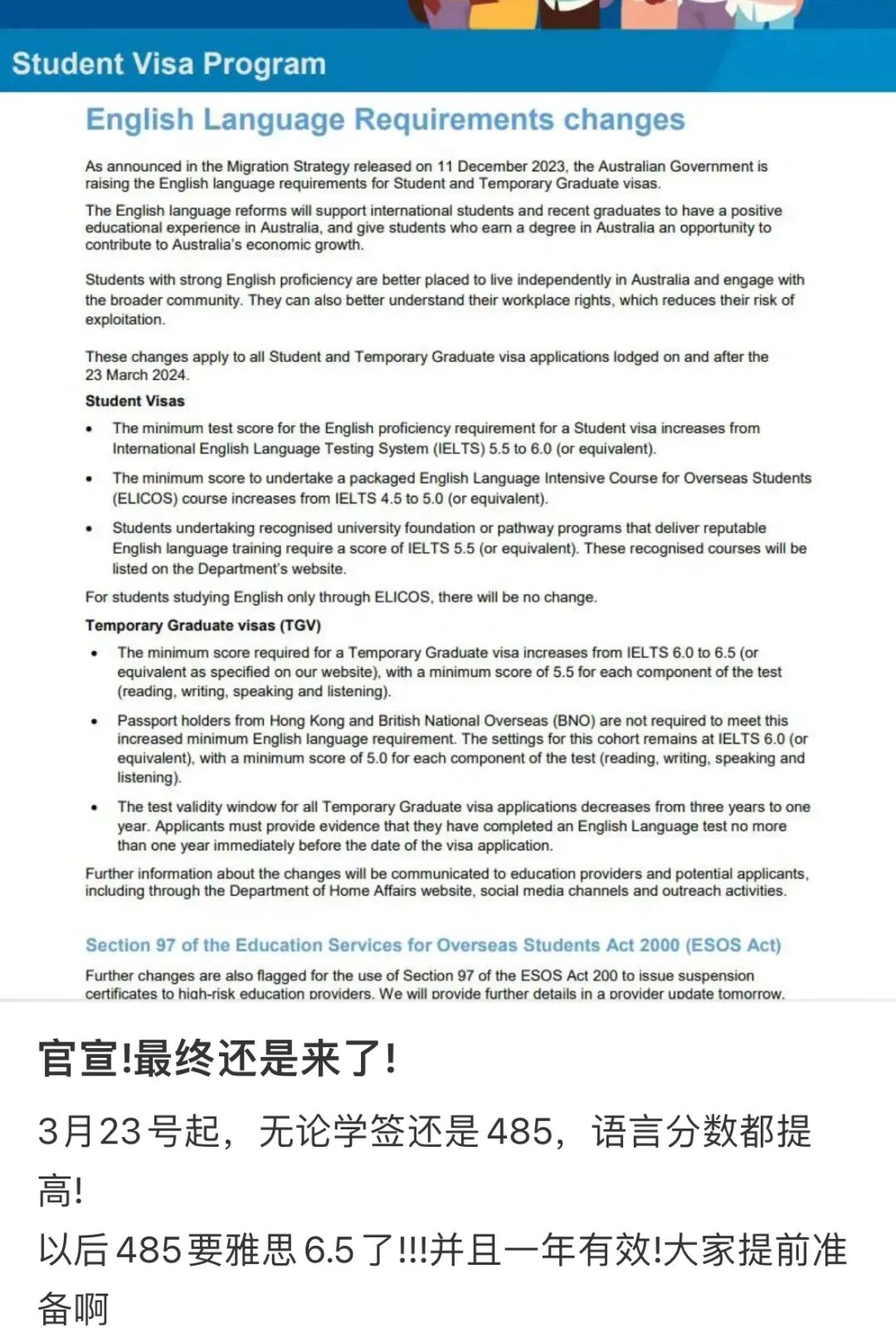 邮件说到,从3月25日起,无论是学生签证还是485毕业后工作签证,语言分数都提高了!