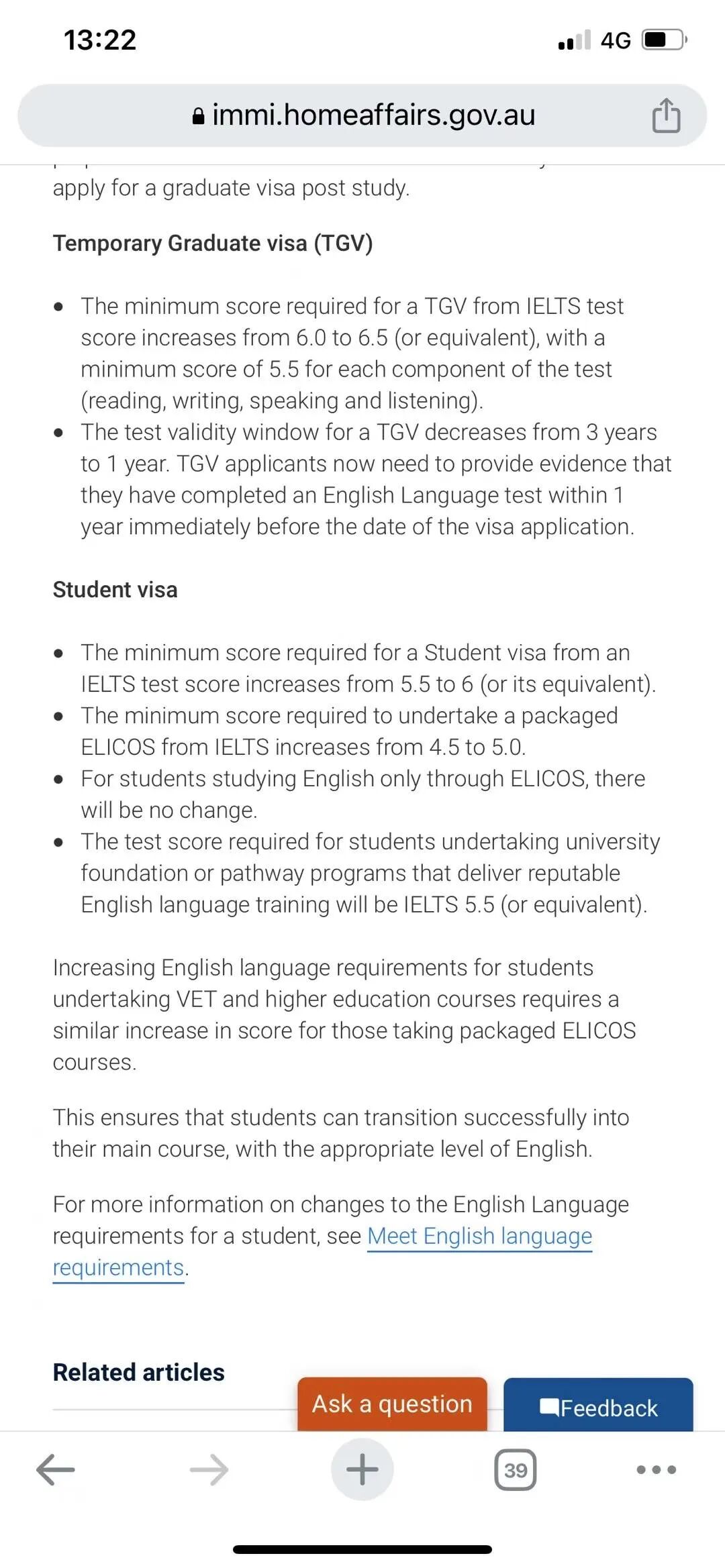 -临时毕业生签证的最低分数要求从雅思6.0分提高到6.5分(或移民局网站上规定的同等分数),考试的每个部分(阅读、写作、口语和听力)的最低分数均为5.5分。