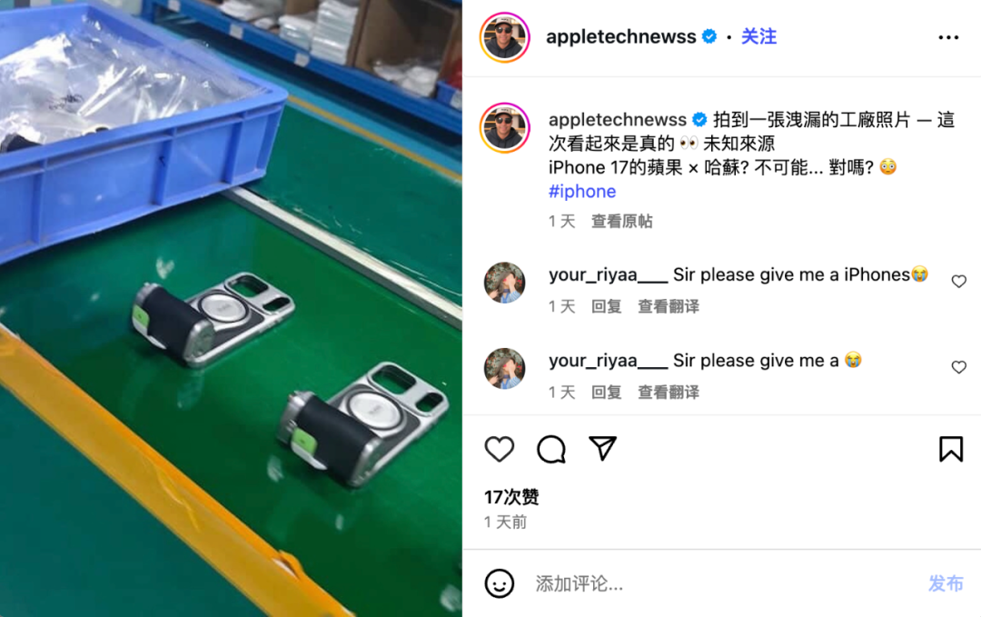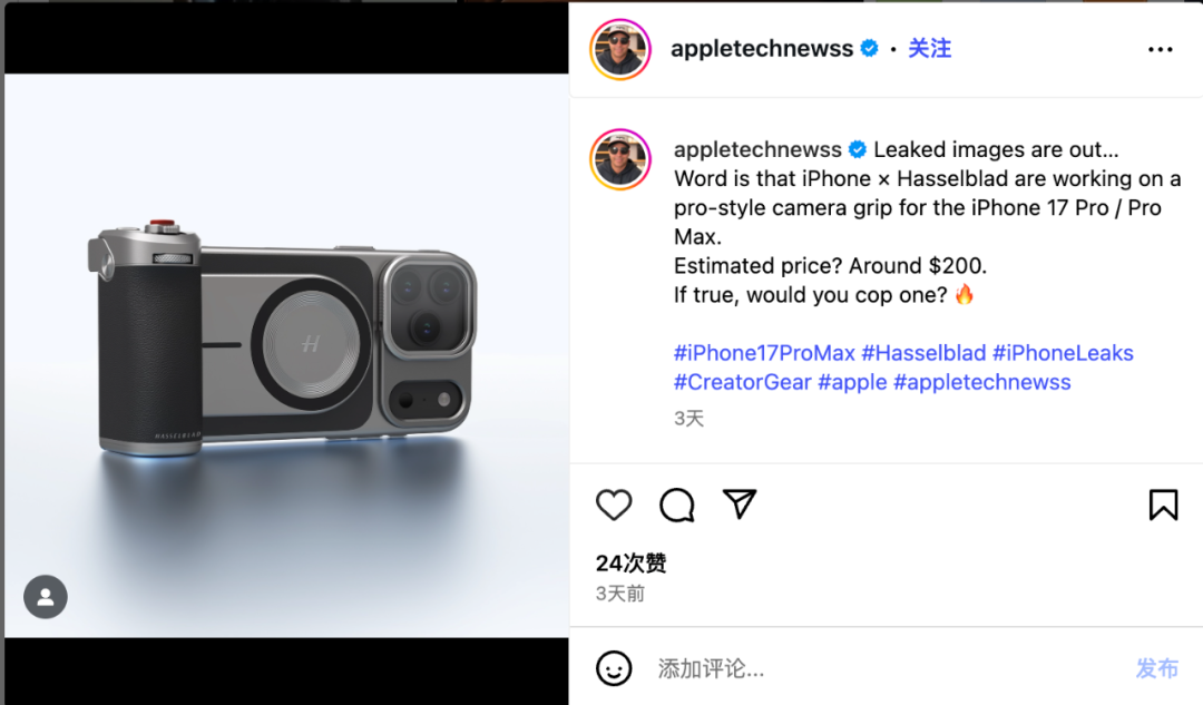 如上图所见,iPhone 17 Pro系列似乎和哈苏合作了一个摄像套装,以定制手机壳+摄影手柄的形式呈现,手机壳上圆形区域疑似放置了哈苏logo。