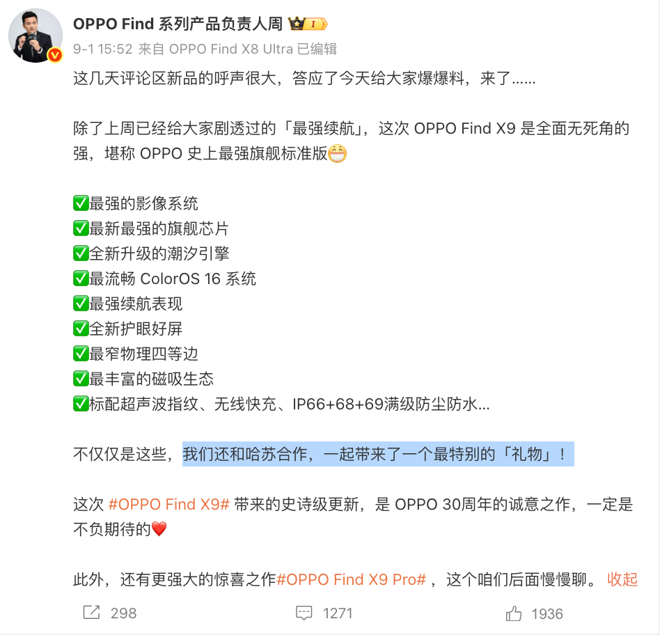 另外值得注意的是,最近OPPO Find系列产品负责人周意保曾预热Find X9系列和哈苏合作,将带来一个
