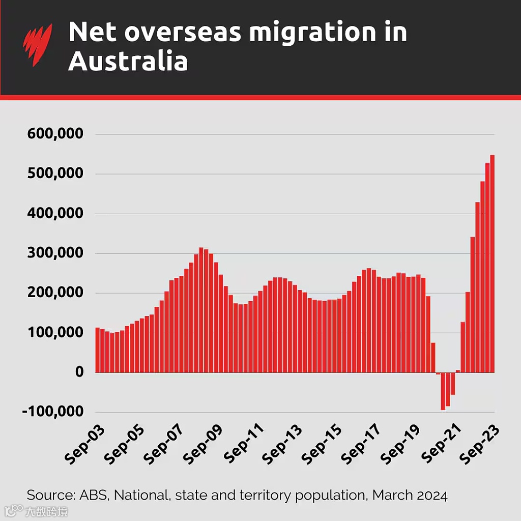根据澳洲统计局的新数据,截至2023年9月30日的一年中,海外净移民人数增长了60%,达到548800人。