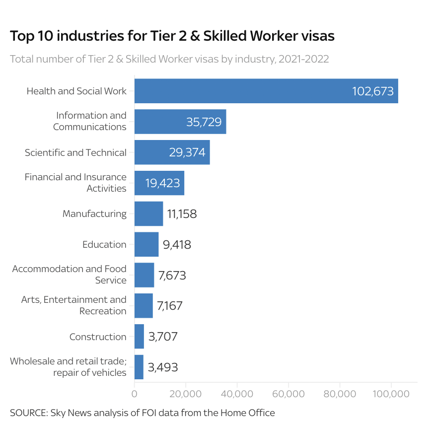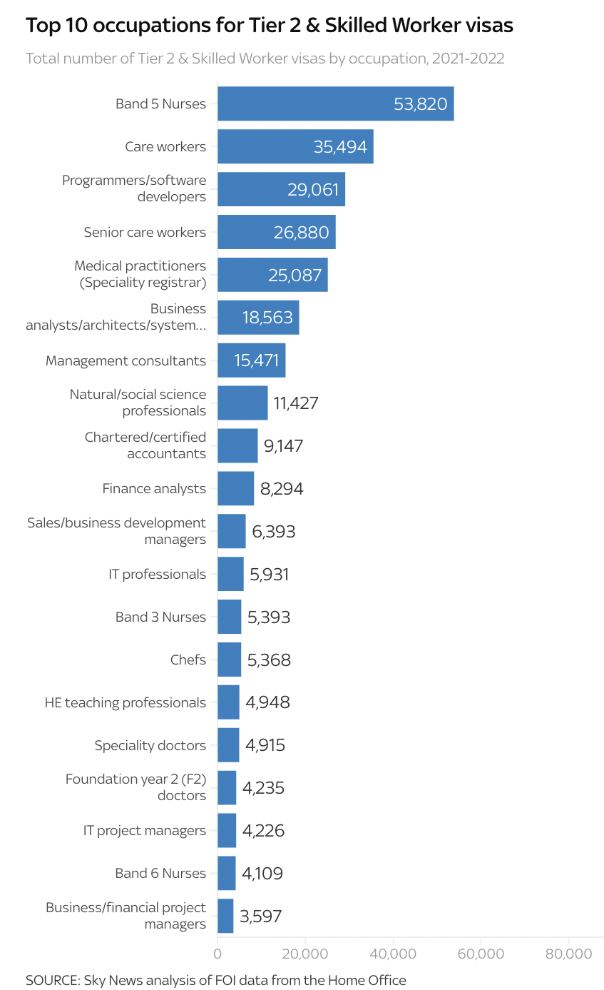 职业方面,卫生部门共发放超过10万工签;软件工程师在整个经济中的需求也特别大——超过35,000名IT专业人士在新系统下来到英国。