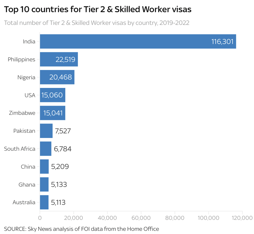 而排名第一的是印度——11.6万个工签,远超菲律宾(22,519)、尼日利亚(20,468)、美国(15,060)。