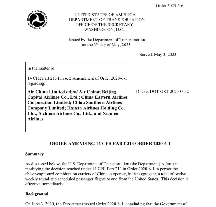 美国交通部在最新文件中表示,修改后的指令适用航空公司达到7家,除了中国国航、中国东航、南方航空、厦门航空,新增了首都航空、海南航空、四川航空。
