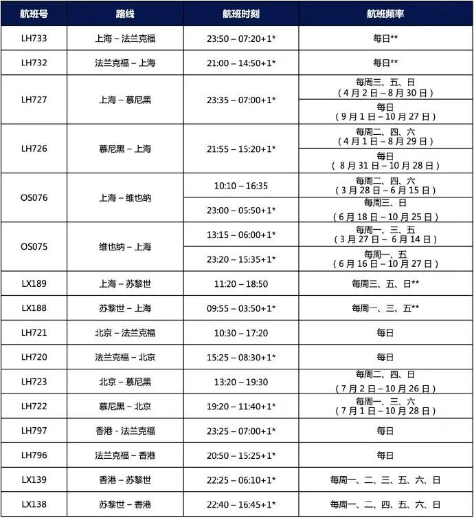 德国汉莎航空公司将进一步增加从德国法兰克福往返上海浦东国际机场航班班数:自2023年2月15日起,汉莎航空将每周运营四班从法兰克福出发前往上海的航班。