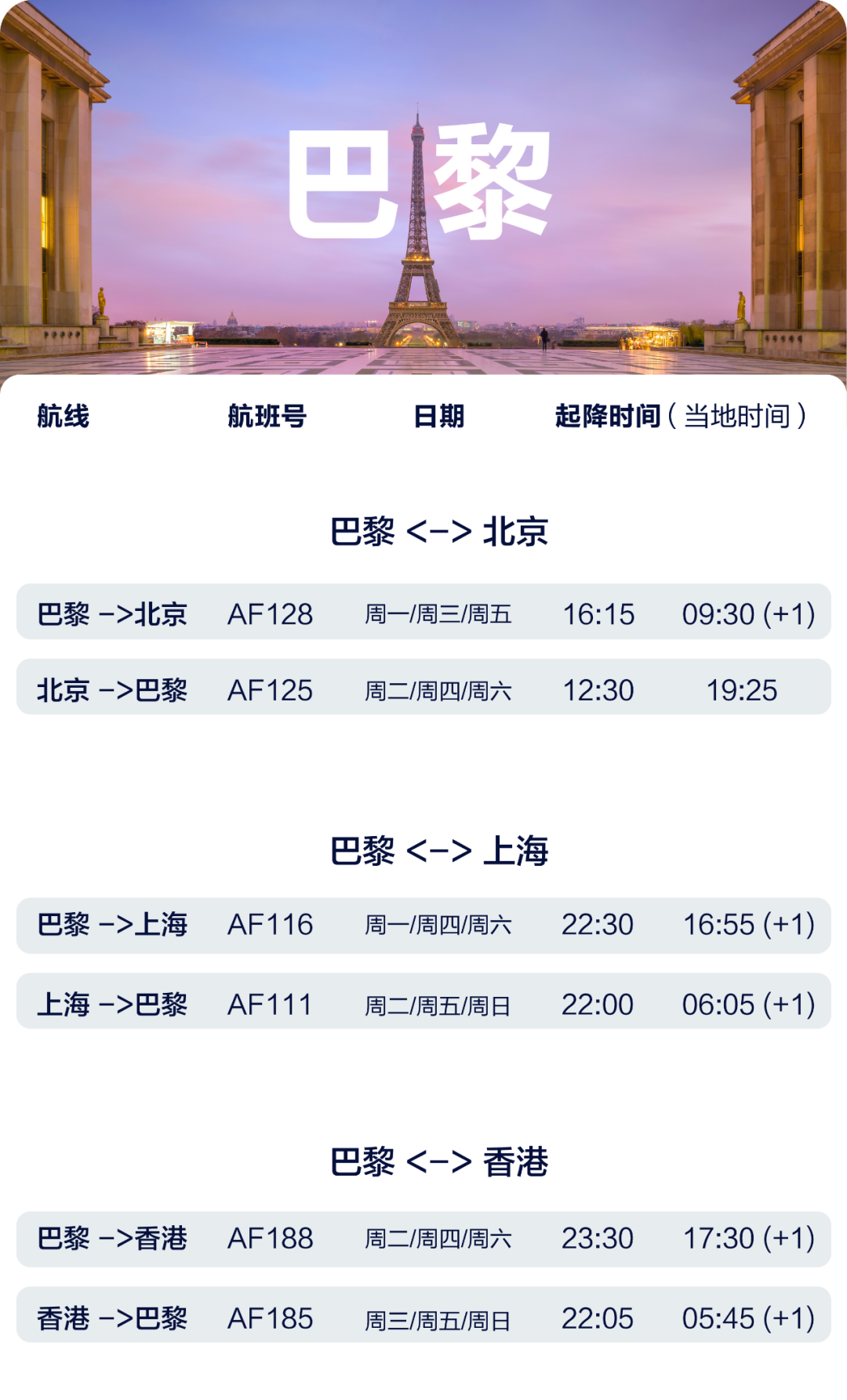 5月起,法航将在中国3个目的地运营9个客运航班:北京(每周3班)、上海(每周3班)以及香港(每周3班)。法航所有从中国飞往巴黎的航班均为直飞航班,一站直达巴黎!
