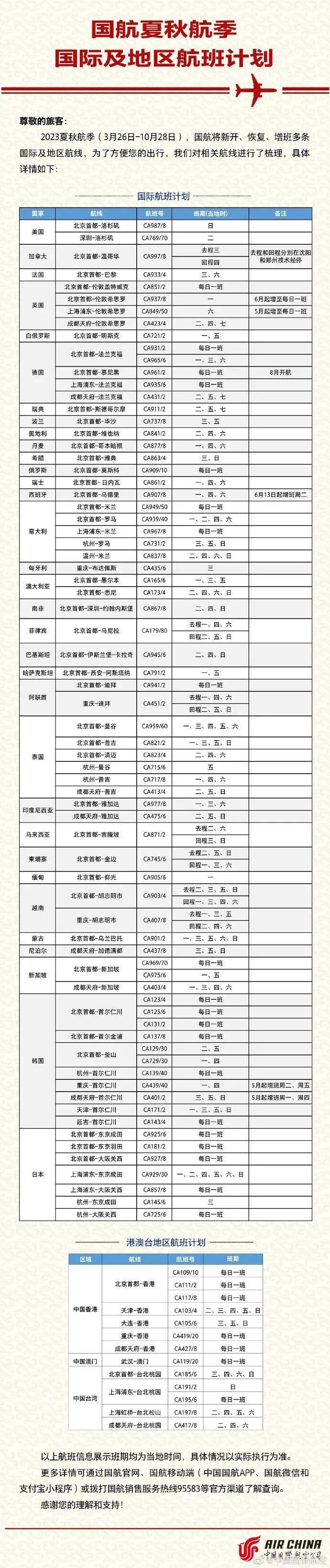 航班班期均为当地时间,航班计划及入境分流点可能根据政策变化进行调整,请您在出行前关注国航官方渠道,查询了解最新航班动态。