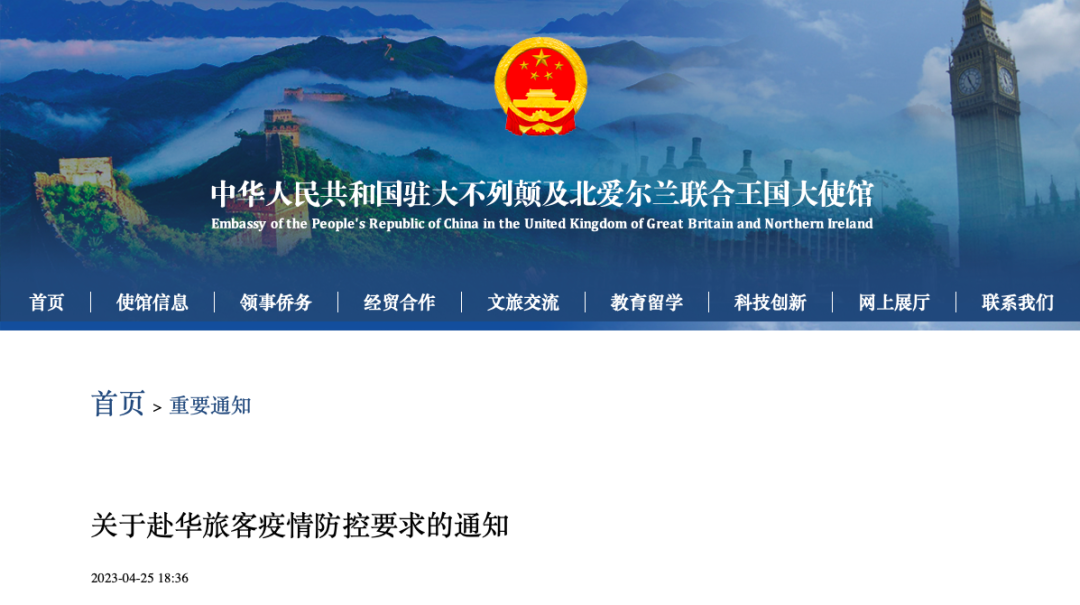 中国驻英国大使馆更新赴华要求通知
