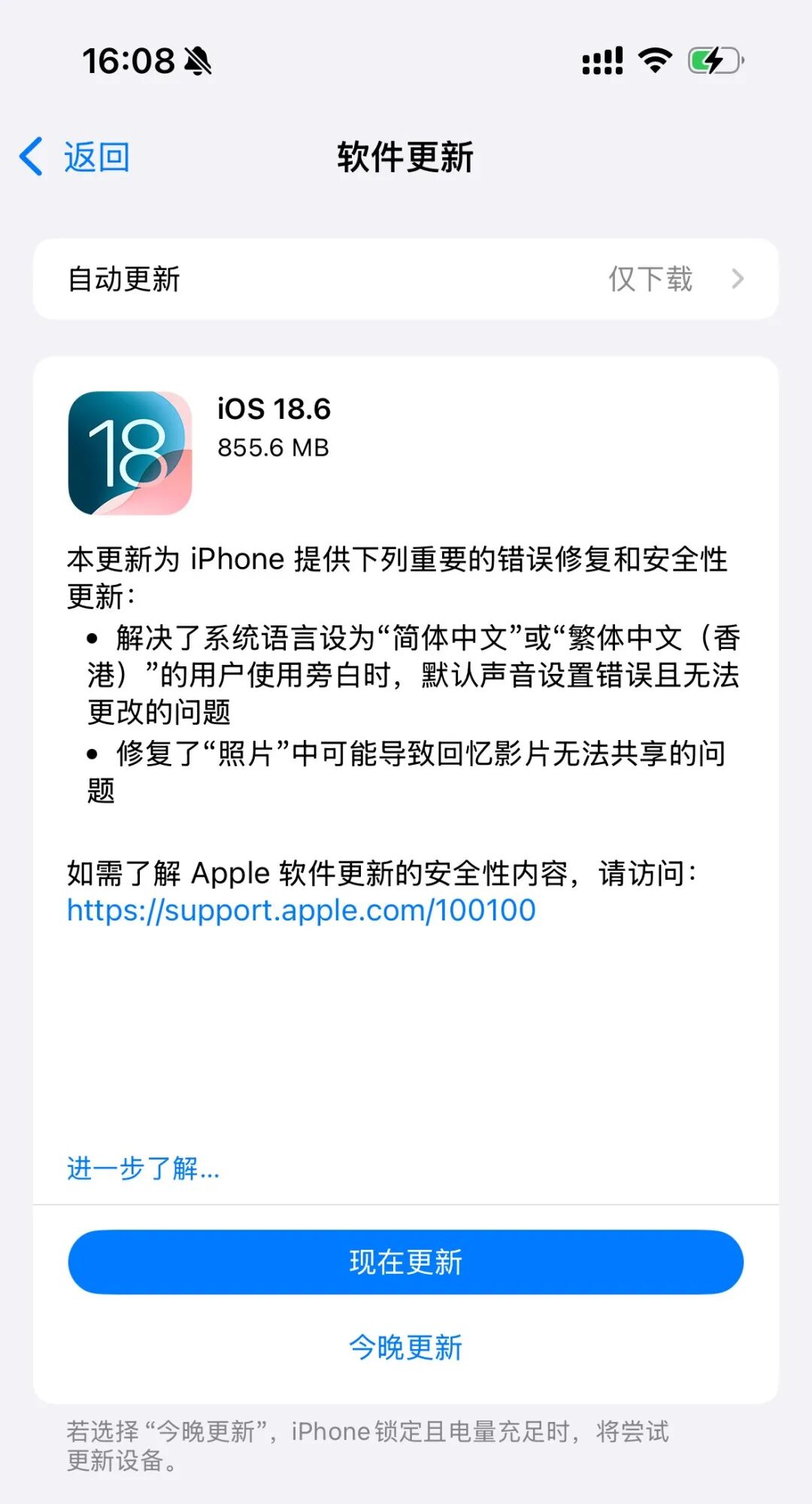 苹果今日向iPhone和iPad用户推送了全新iOS 18.6正式版和iPadOS 18.6正式版。