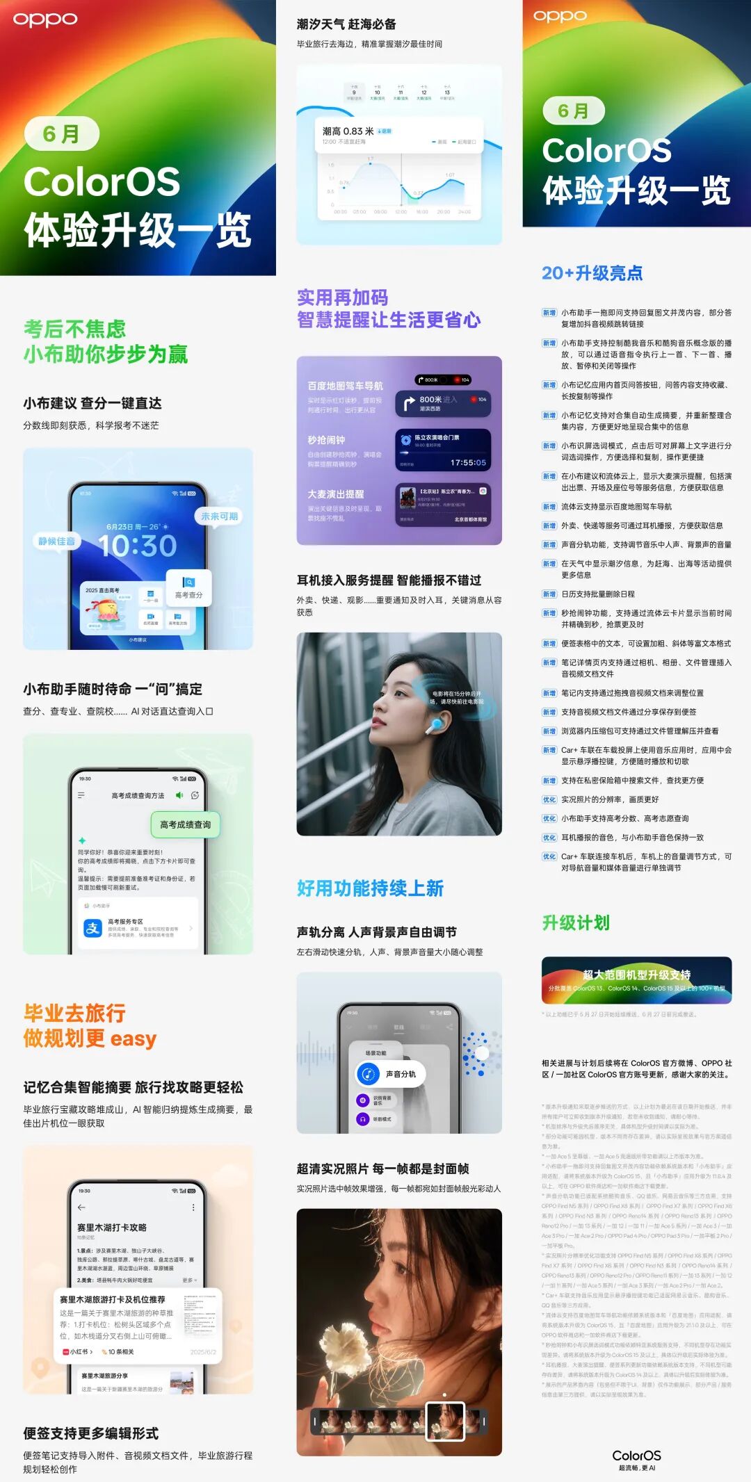 如上图所见,6月ColorOS主要更新内容有:一键直达查考分、规划专属毕业旅行;流体云支持百度地图驾车导航、秒抢闹钟、大麦演出提醒;服务提醒耳机同步;声音分轨,人声伴奏随心调整等等。