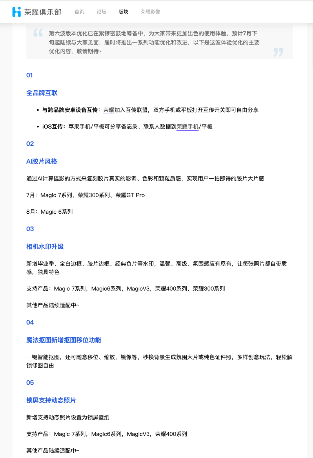 另一边荣耀系统也有新消息。最近荣耀Magic V5预热支持全品牌互传,有网友询问其它机型何时支持,昨日荣耀俱乐部预告了第六波体验优化,预计7月下旬起OTA,正式