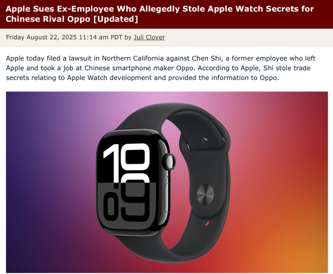 近日,外媒报道称苹果向加州北区法院提交了一份诉讼,指控前Apple Watch传感系统架构师Chen Shi携带63份机密文件加入OPPO。