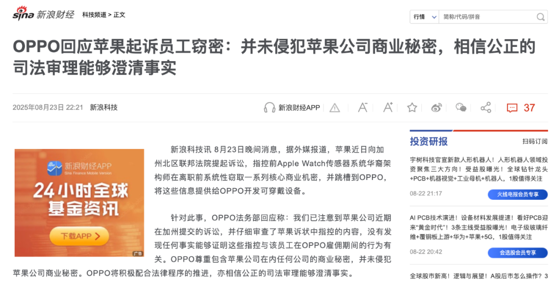 针对此事,新浪科技报道OPPO法务部官方回应称:“我们已注意到苹果公司近期在加州提交的诉讼,并仔细审查了苹果诉状中指控的内容,没有发现任何事实能够证明这些指控与该员工在OPPO雇佣期间的行为有关。OPPO尊重包含苹果公司在内任何公司的商业秘密,并未侵犯苹果公司商业秘密。OPPO将积极配合法律程序的推进,亦相信公正的司法审理能够澄清事实。”现在就先等后续消息了。