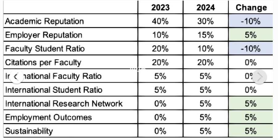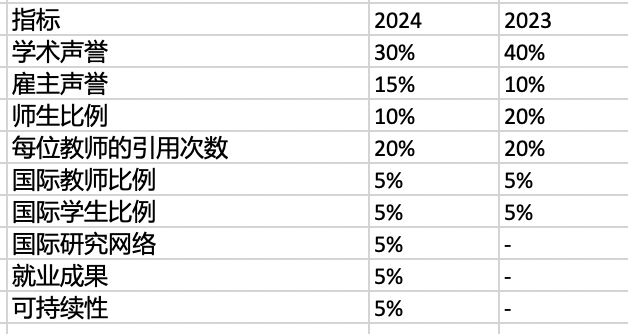 其余维度的占比变化主要体现在:学术声誉和雇主声誉,占比分别下降了10%和5%。