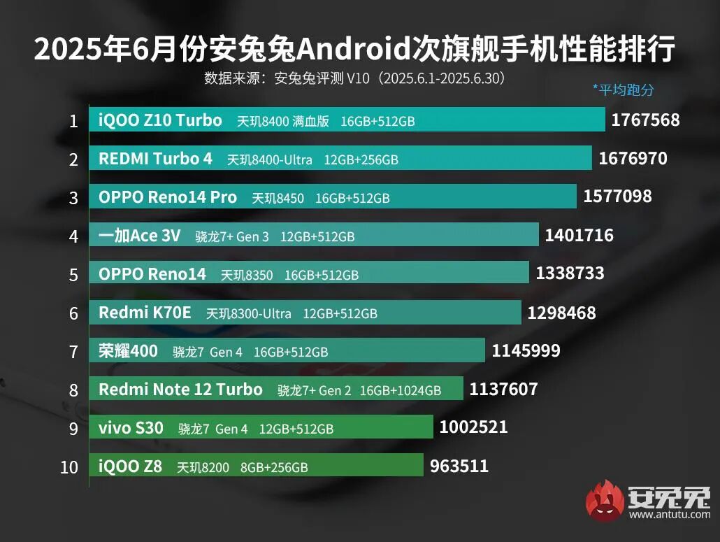 首先是安卓旗舰机榜,主要是骁龙8至尊版和天玑9400系列的天下,目前搭载骁龙8至尊领先版的红魔10S Pro+蝉联第一。