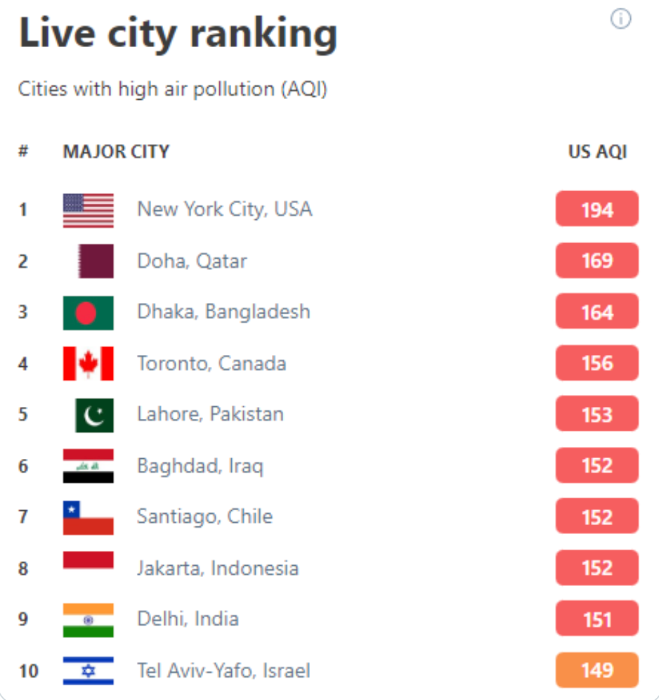根据瑞士监测服务机构IQAir.com的数据,纽约市的空气质量指数在美东时间周四中午为163,一度排在“世界最差空气”城市的第一位。