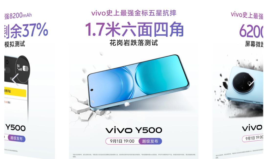 如上图所见,vivo Y500宣布将于9月1日19点发布,称主打「续航耐用双灭霸」,是vivo史上最强续航8200mAh,IP69+/IP69/IP68满级防水,通过SGS金标五星抗跌耐摔认证以及军标环境测试。