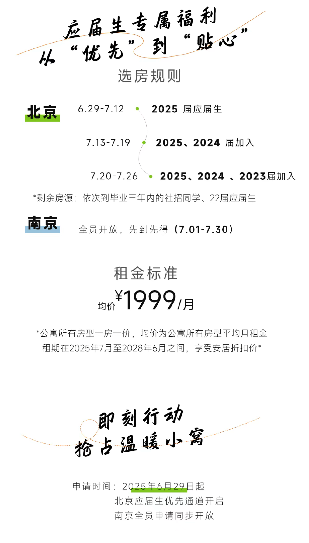小米北京青年公寓有2658间,坐落于昌平定泗路,29m²,独立卫浴+智能家居,班车直达园区,通勤约30分钟,同时还提供多个共享空间用于学习休闲娱乐,小米工卡一卡通刷全覆盖。首批6.29-7.12面向2025届应届生开放申请,第二批是7.13-7.19,面向2025和2024届加入的同学;第三批是7.20-7.26面向2025、2024和2023届加入的员工。剩余房源则依次面向毕业三年内的社招同学、2022届应届生。