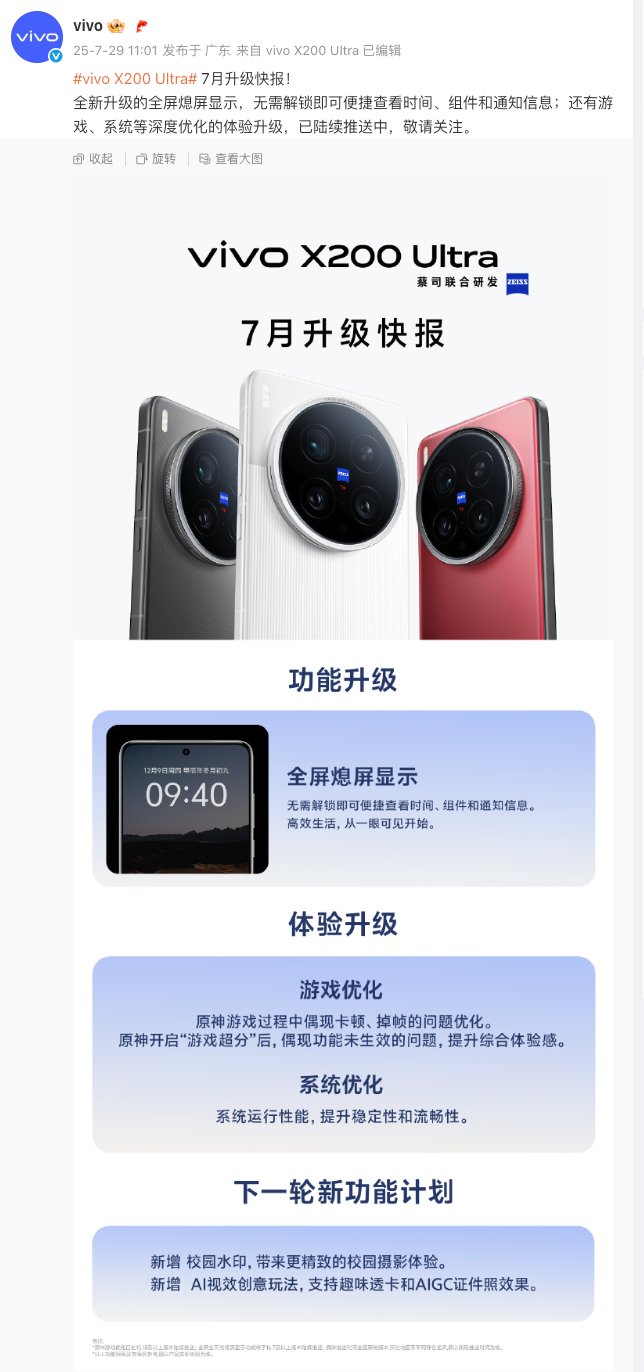 上个月vivo X200 Ultra系统更新节奏收到了不少用户吐槽,7月以来vivo官方公布了更多升级计划。