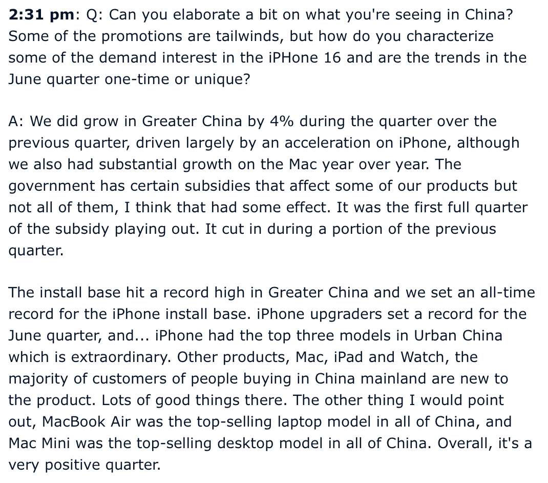 库克在财报电话会议中表示,与上一季度相比,苹果在大中华区收入增长4%,主要得益于iPhone的推动(尽管Mac也同比大幅增长,比如MacBook Air是全中国最畅销的笔记本电脑型号等等),政府补贴影响了苹果的大部分产品等等。