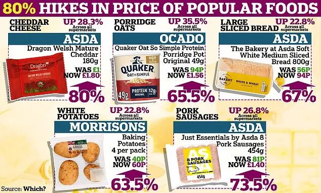 与去年同期相比,所有8家超市的燕麦粥成本平均上升了35.5%;800克白面包片的平均涨幅为22.8%;白薯的平均通货膨胀率约为14%;猪肉香肠则平均上涨了26.8%。