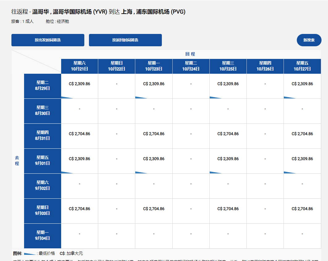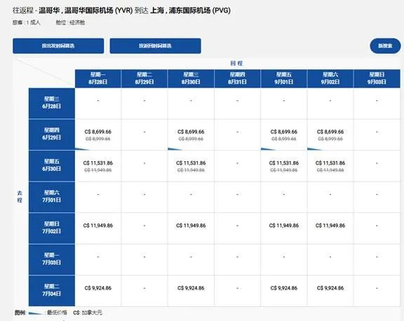 另外,四川航空、厦门航空、加拿大航空的票价稍微正常一点,往返2000刀左右。