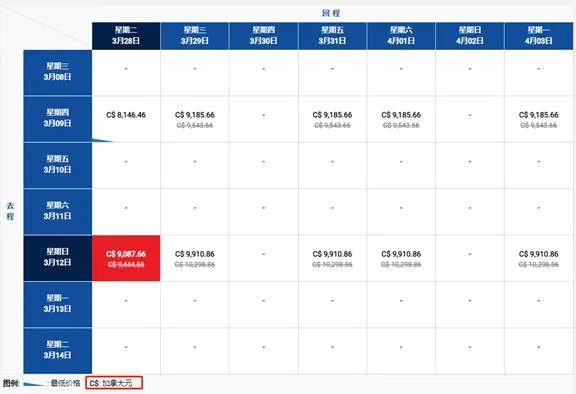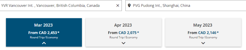 达达随手上国航官网看了一眼,3月9日出发、28日回来的温哥华往返上海机票,票价如下: