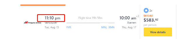 8月15日,温哥华中转马尼拉飞厦门,中转2个多小时,机票585刀,只不过起飞时间比较晚,晚上11点10分飞,早上10点到,也还行。
