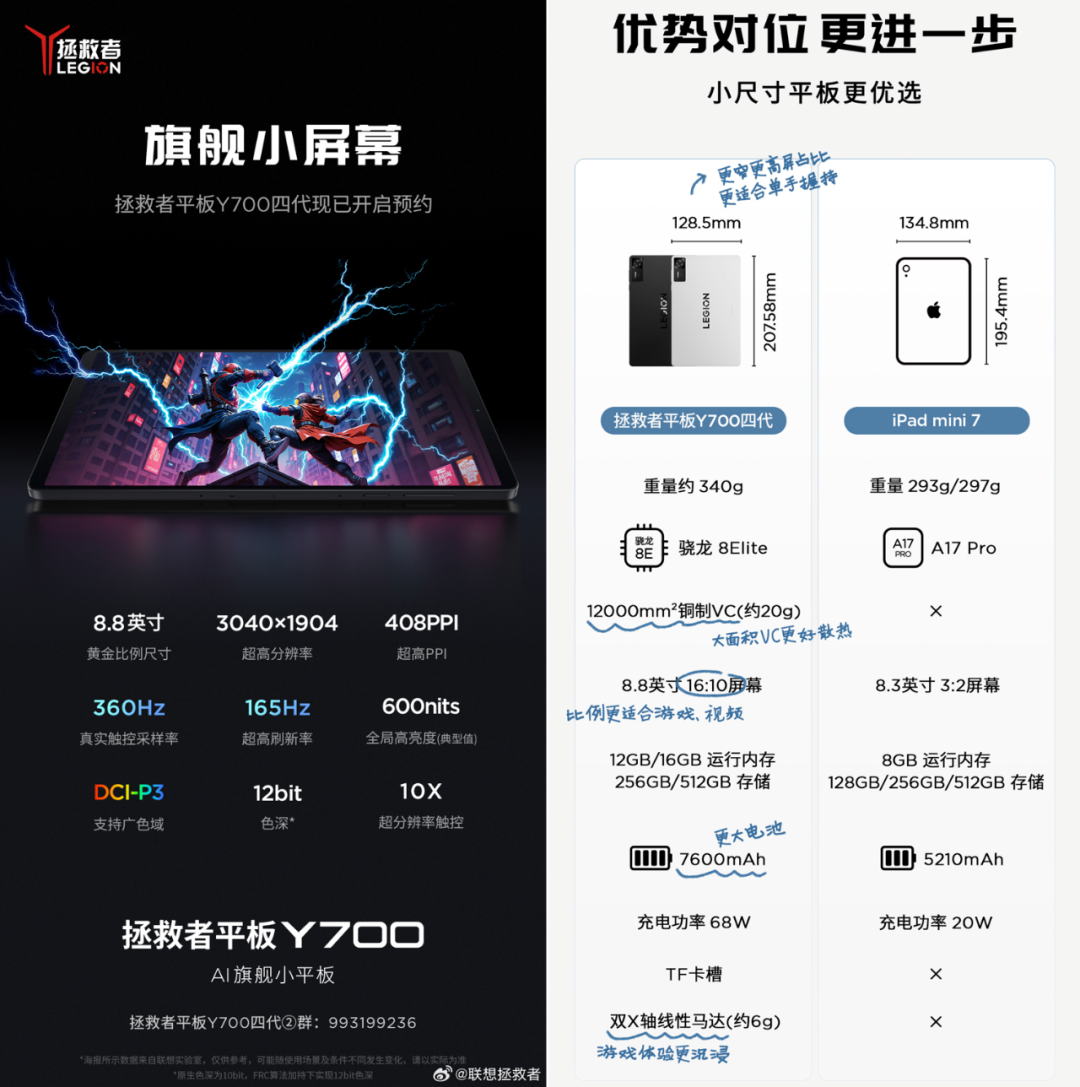 这波小平板中最大的,所以机身会相对更厚重一点点。作为对比,拯救者Y700第四代是