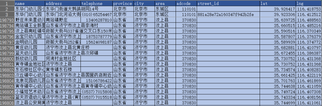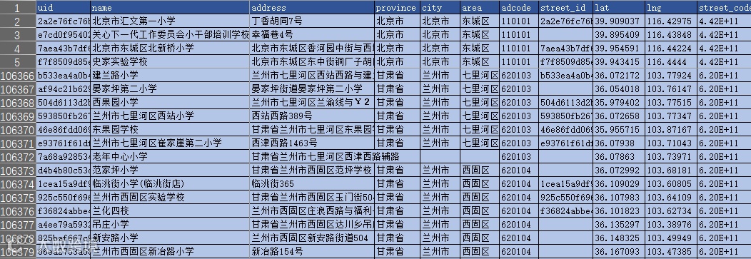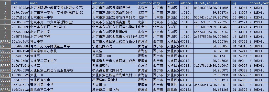 皮皮侠从百度POI整理了中国所有K12学校的特征信息,截止时间2020年末。数据指标含学校名称、地址、省份、城市、经度、纬度、街道号。我们分享的数据含幼儿园150000条,小学110000条,中学60000条(仅为全样本75%,用于学术已无问题,当然成为会员可以获得全样本)。仁者见仁智者见智,做研究肯定是有价值的,如可以测算区域教育资源的分布特征。数据demo如下: