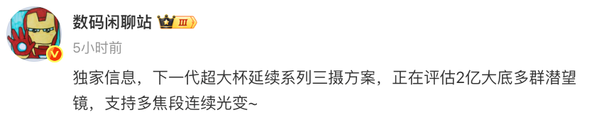 如上图所见,爆料达人数码闲聊站今日称“独家信息,下一代超大杯延续系列三摄方案,正在评估2亿大底多群潜望镜,支持多焦段连续光变~” 由于未指名道姓,所以不好分析具体机型。但结合评论区猜测这款超大杯有可能是小米16 Ultra。
