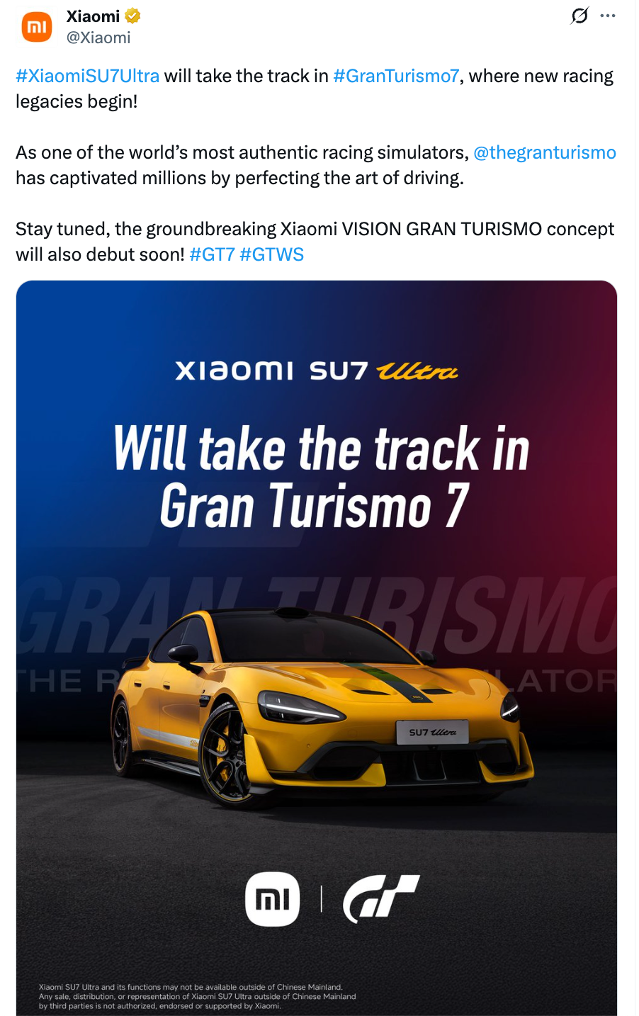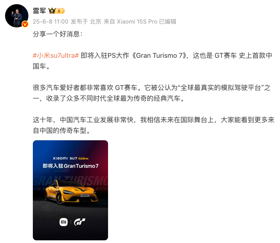 【前沿】雷军宣布小米SU7Ultra成为GT赛车首款中国车