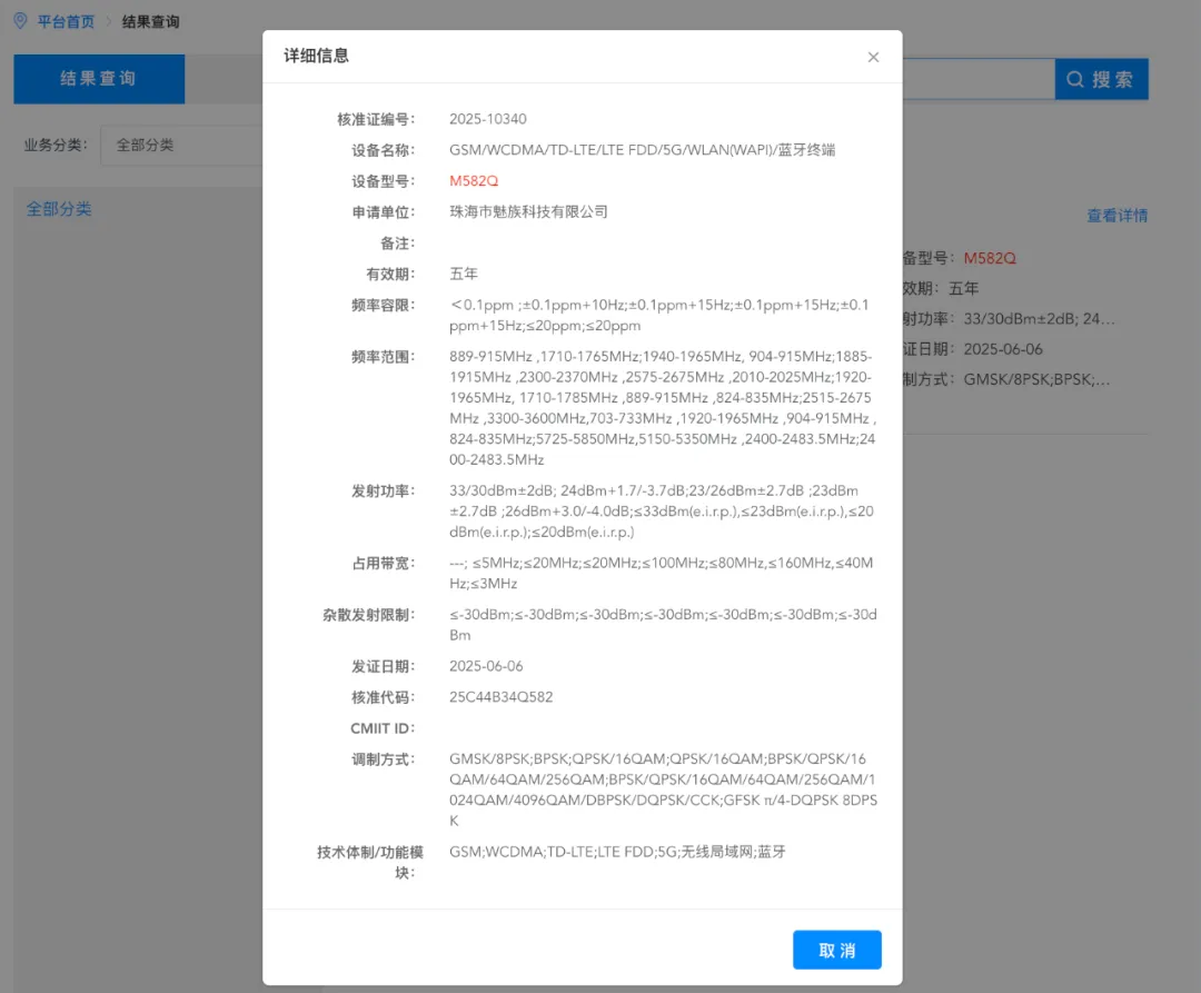 如上图所见,最近魅族有一款型号为M582Q的新机入网,爆料达人数码闲聊站推测其可能是魅族22小屏版,目前三证齐全,备案