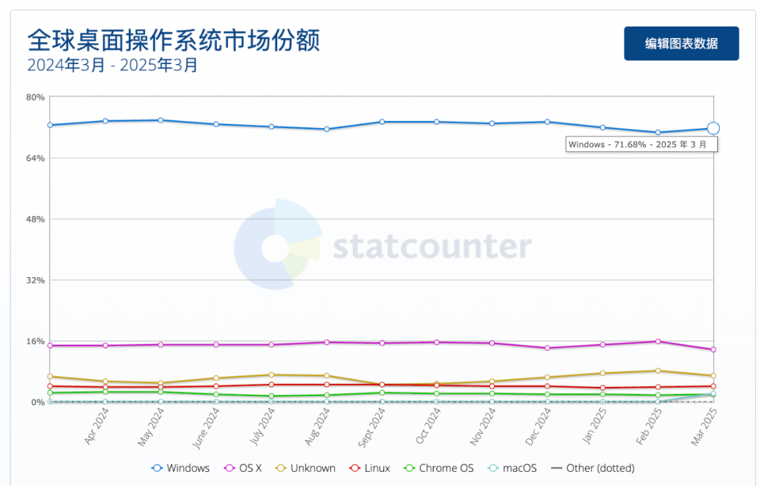 至于全球桌面操作系统市场,2025年3月Windows份额为71.68%,OS X份额为13.59%,macOS份额为2.11%。问问大家,你现在用的哪家操作系统?