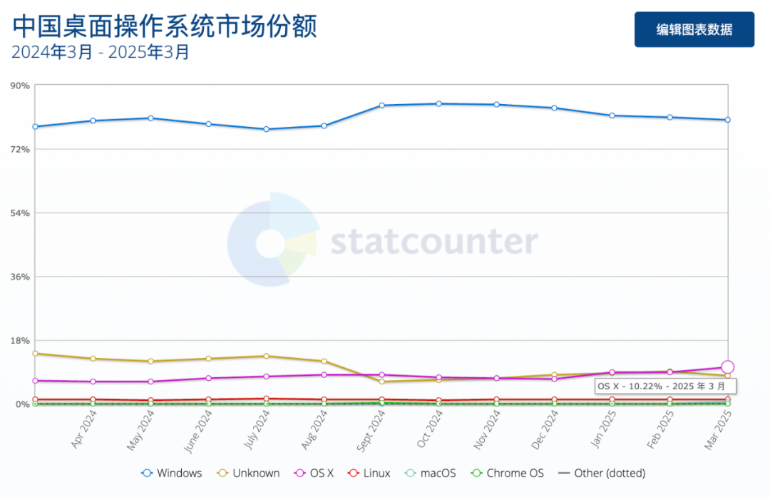 近日IT之家援引Statcounter数据报道:2025年3月苹果macOS在中国桌面操作系统的市场份额首次突破10%,2024年12月macOS的份额还是7.05%,最近几个月一路增长,上个月已经增长至10.22%。