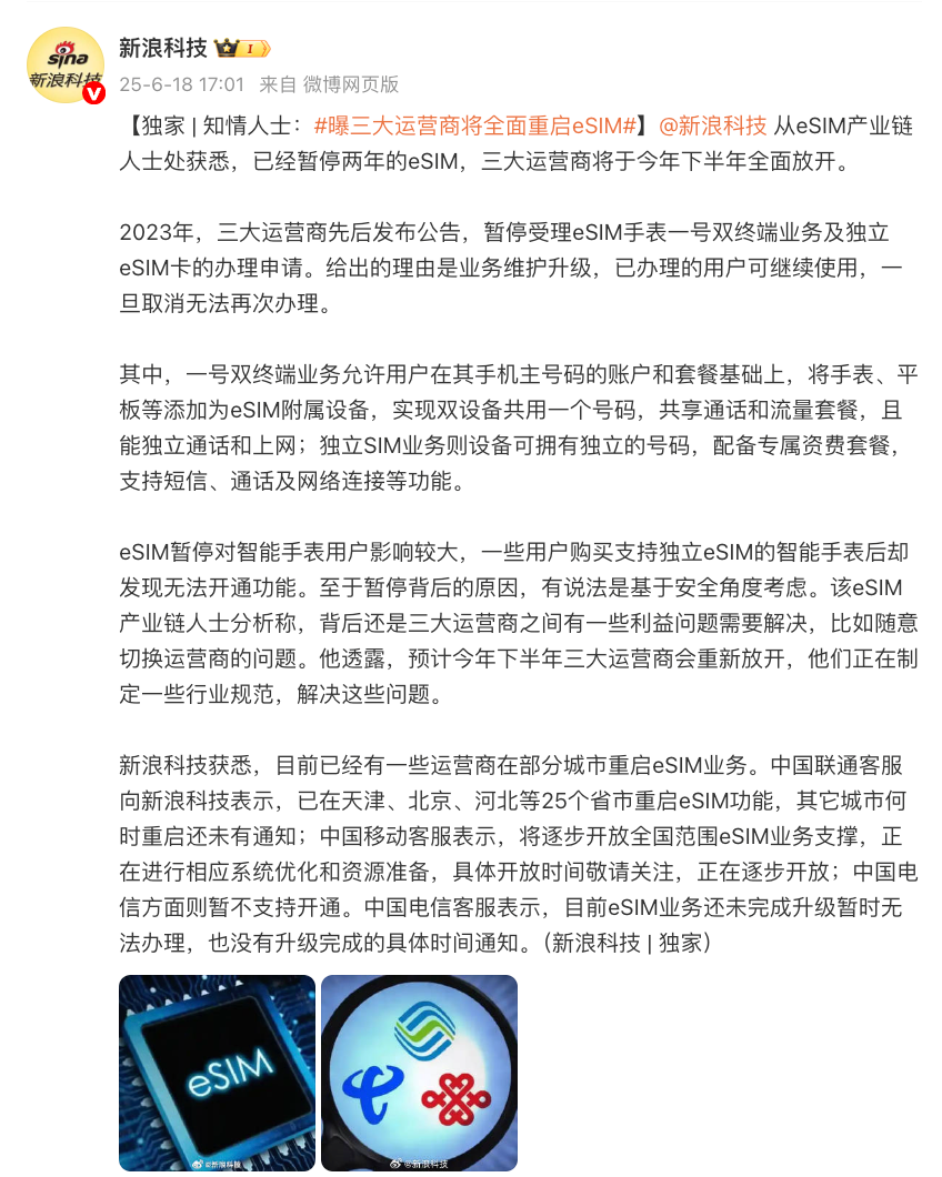 新浪科技独家报道称:从eSIM产业链人士处获悉,已经暂停两年的eSIM,三大运营商将于今年下半年全面放开。目前已经有一些运营商在部分城市重启eSIM业务。中国联通客服向新浪科技表示,已在天津、北京、河北等25个省市重启eSIM功能,其它城市何时重启还未有通知;中国移动客服表示,将逐步开放全国范围eSIM业务支撑,正在进行相应系统优化和资源准备,具体开放时间敬请关注,正在逐步开放;中国电信方面则暂不支持开通,客服表示,目前eSIM业务还未完成升级暂时无法办理,也没有升级完成的具体时间通知。